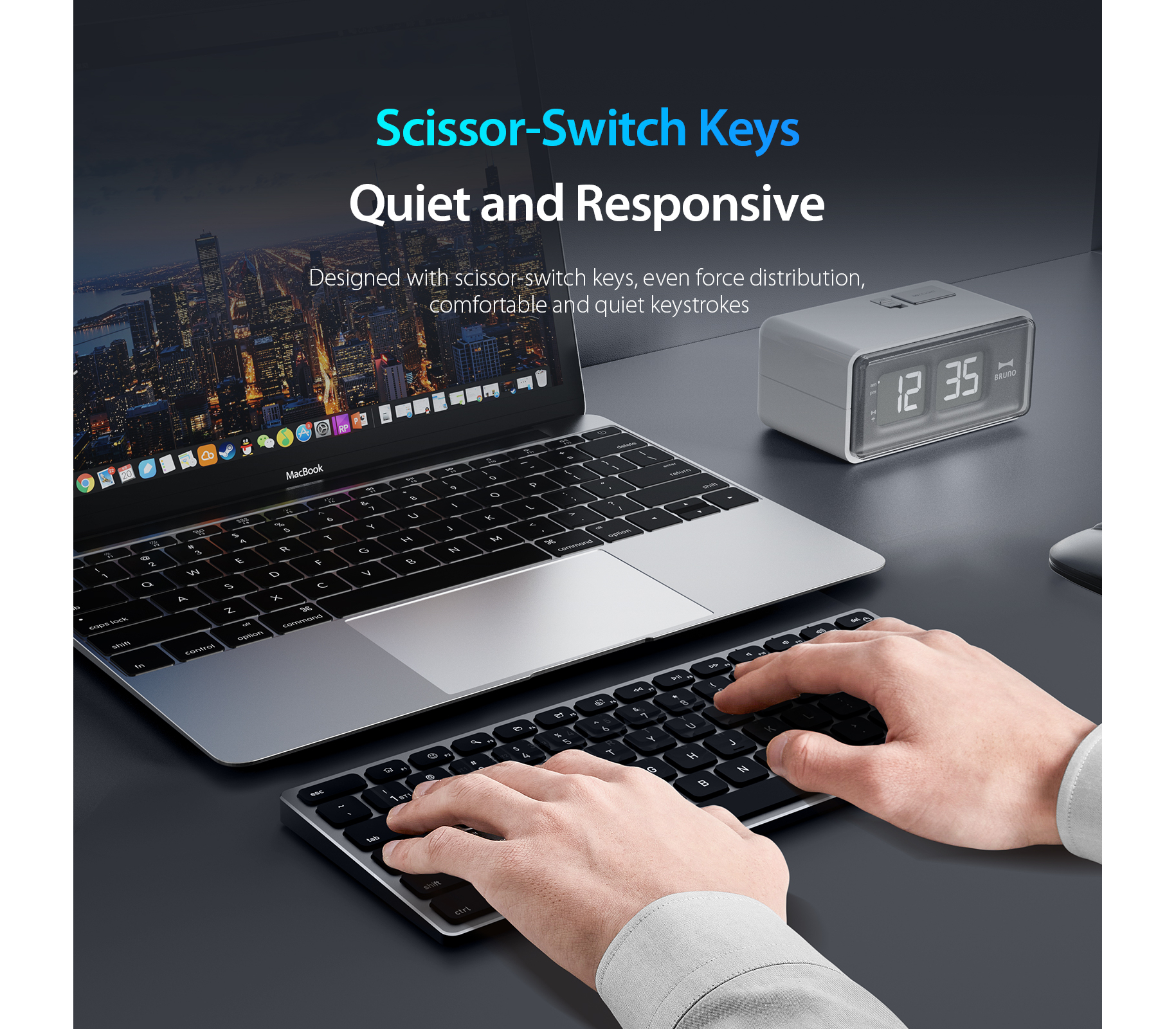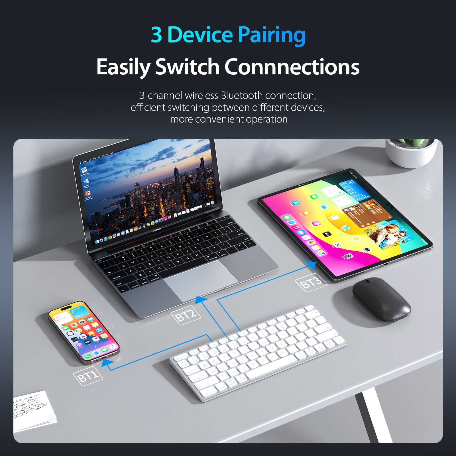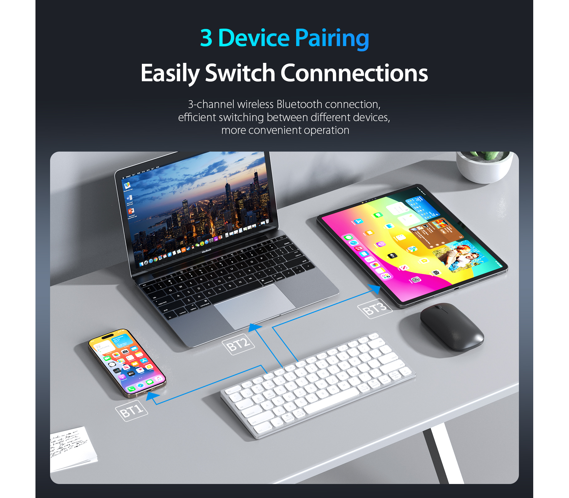 Sản phẩm hỗ trợ kết nối cùng lúc 3 thiết bị, cho phép chuyển đổi nhanh giữa điện thoại, tablet và laptop chỉ với một nút bấm, giúp tối ưu hiệu suất làm việc.