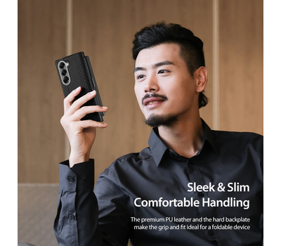 Ốp lưng được làm từ da PU cao cấp kết hợp với mặt lưng cứng, mang lại cảm giác cầm nắm chắc chắn và vừa vặn cho điện thoại gập. Thiết kế mỏng nhẹ và tinh tế giúp bạn thoải mái sử dụng hàng ngày.