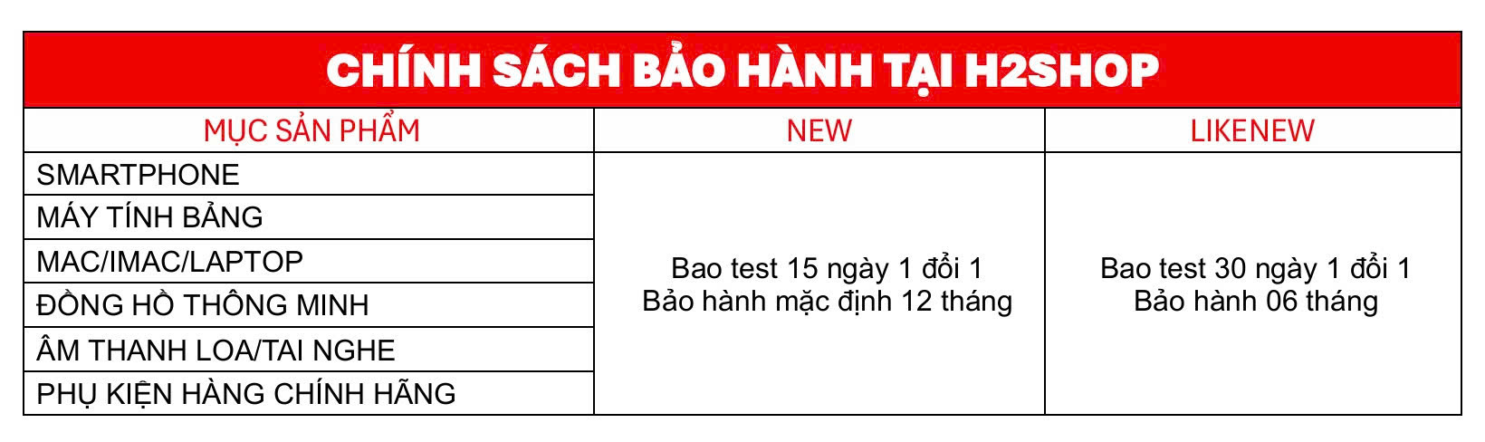 Chính sách bảo hành và đổi trả áp dụng cho các sản phẩm sau khi mua tại H2SHOP.VN: