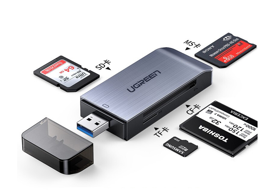 Đây là đầu đọc thẻ nhớ USB 3.0 4 trong 1 Ugreen, hỗ trợ nhiều loại thẻ nhớ: