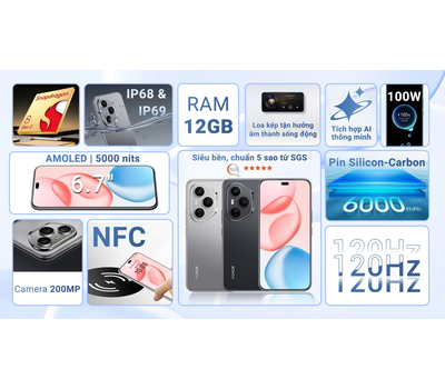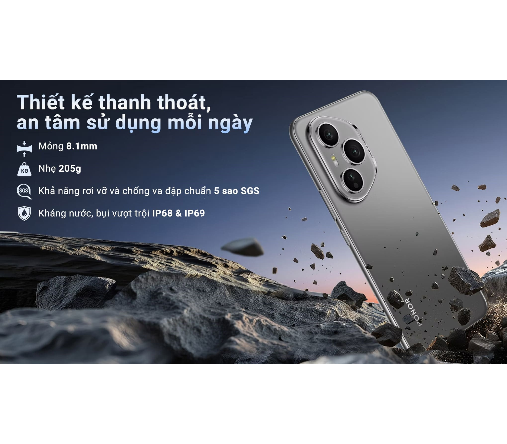 HONOR 400 Pro được thiết kế bền bỉ cho mọi tình huống hằng ngày. Máy đạt chứng nhận 5 sao từ tổ chức SGS về khả năng chống rơi, mang lại sự yên tâm khi sử dụng. Ngoài chuẩn kháng nước bụi IP68 quen thuộc, máy còn đạt cả IP69 chống tia nước mạnh, nhiệt độ cao và có thể rửa dưới vòi. Đây là minh chứng cho độ bền vượt trội, sẵn sàng đồng hành trong mọi điều kiện.