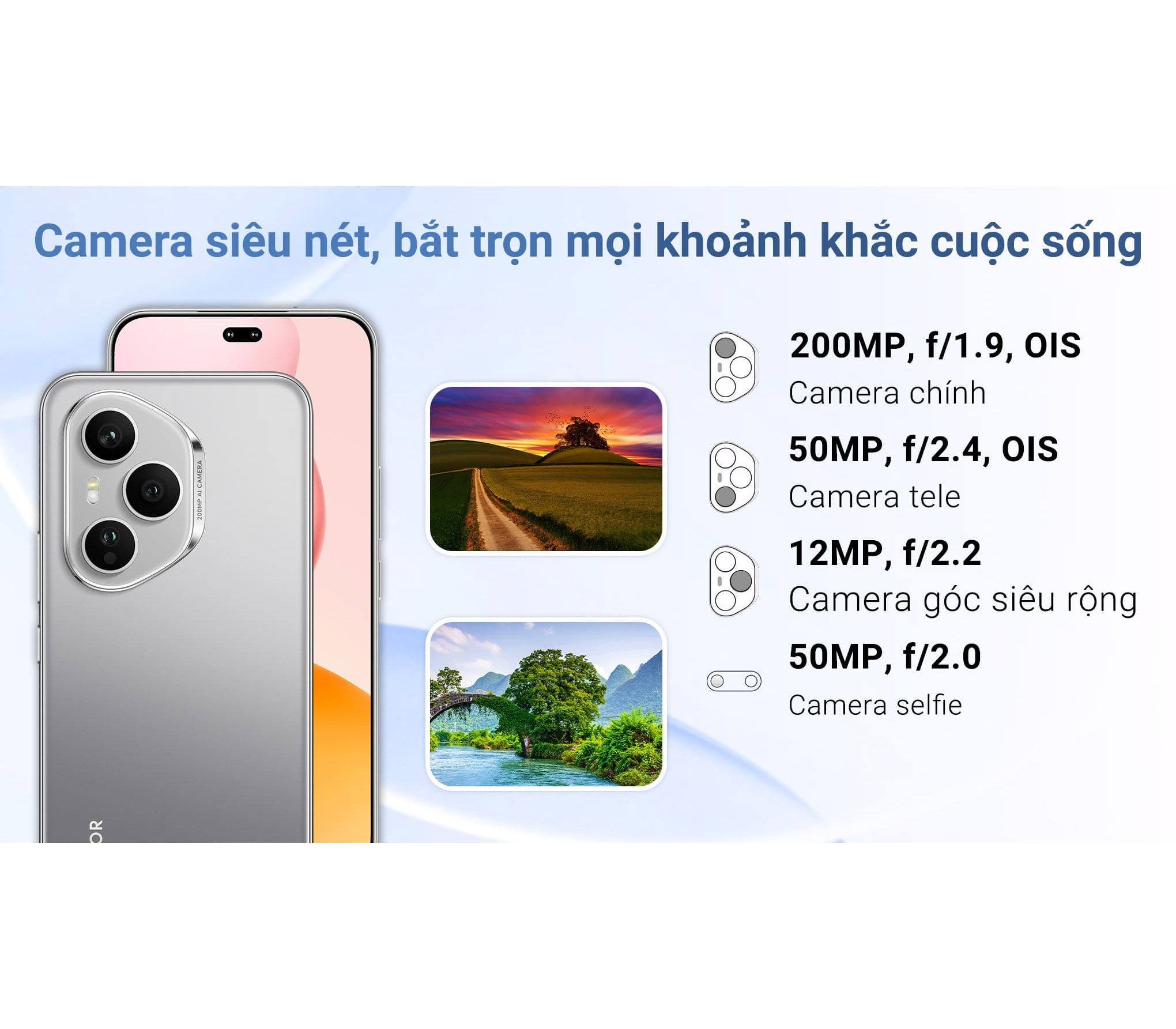 HONOR 400 Pro trang bị hệ thống camera ấn tượng. Camera chính 200 MP dùng cảm biến lớn 1/1.4 inch và mô hình AI RAW, tăng độ nét 50% và cải thiện ảnh thiếu sáng. Camera tele 50 MP dùng cảm biến Sony IMX856, hỗ trợ zoom quang 3x và chụp chân dung. Camera selfie 50 MP cho ảnh sắc nét, tự nhiên, lý tưởng cho chụp ảnh và sáng tạo nội dung.