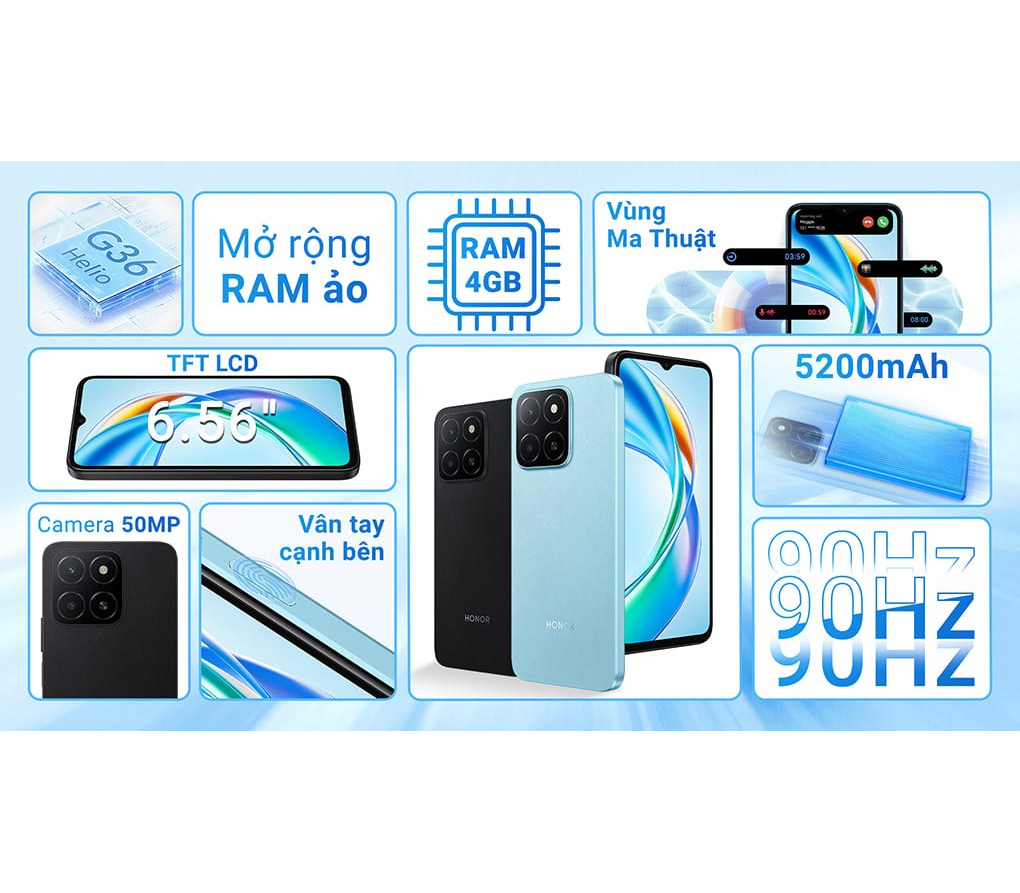 Sức mạnh của chiếc điện thoại HONOR này đến từ vi xử lý MediaTek Helio G36 với 8 nhân, bao gồm 4 nhân 2.2 GHz và 4 nhân 1.6 GHz, giúp thiết bị xử lý mượt mà từ các tác vụ thông thường đến các ứng dụng đòi hỏi hiệu năng cao. Đi kèm với đó là GPU IMG PowerVR GE8320, mang lại khả năng xử lý đồ họa tốt, đáp ứng nhu cầu chơi game và sử dụng ứng dụng đồ họa.