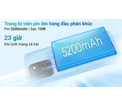 HONOR X5b Plus sở hữu viên pin dung lượng lớn 5200 mAh, đủ sức đáp ứng một ngày dài sử dụng liên tục. Máy có thời lượng sử dụng ấn tượng, lên đến 23 giờ với các tác vụ cơ bản. Điểm đặc biệt là công nghệ tiết kiệm pin thông minh, cho phép kéo dài thời gian chờ thêm 19 giờ khi pin chỉ còn 10%.