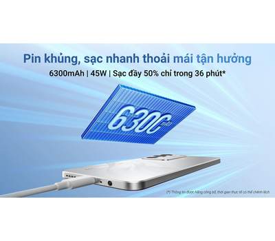 Điện thoại sở hữu viên pin lớn 6300 mAh, cho thời gian sử dụng cả ngày dài dù chơi game hay xem video liên tục. Dung lượng pin ấn tượng này giúp người dùng yên tâm sử dụng với cường độ cao. Ngoài ra, công nghệ tiết kiệm pin thông minh còn góp phần kéo dài thời lượng sử dụng, mang đến trải nghiệm bền bỉ và tiện lợi.