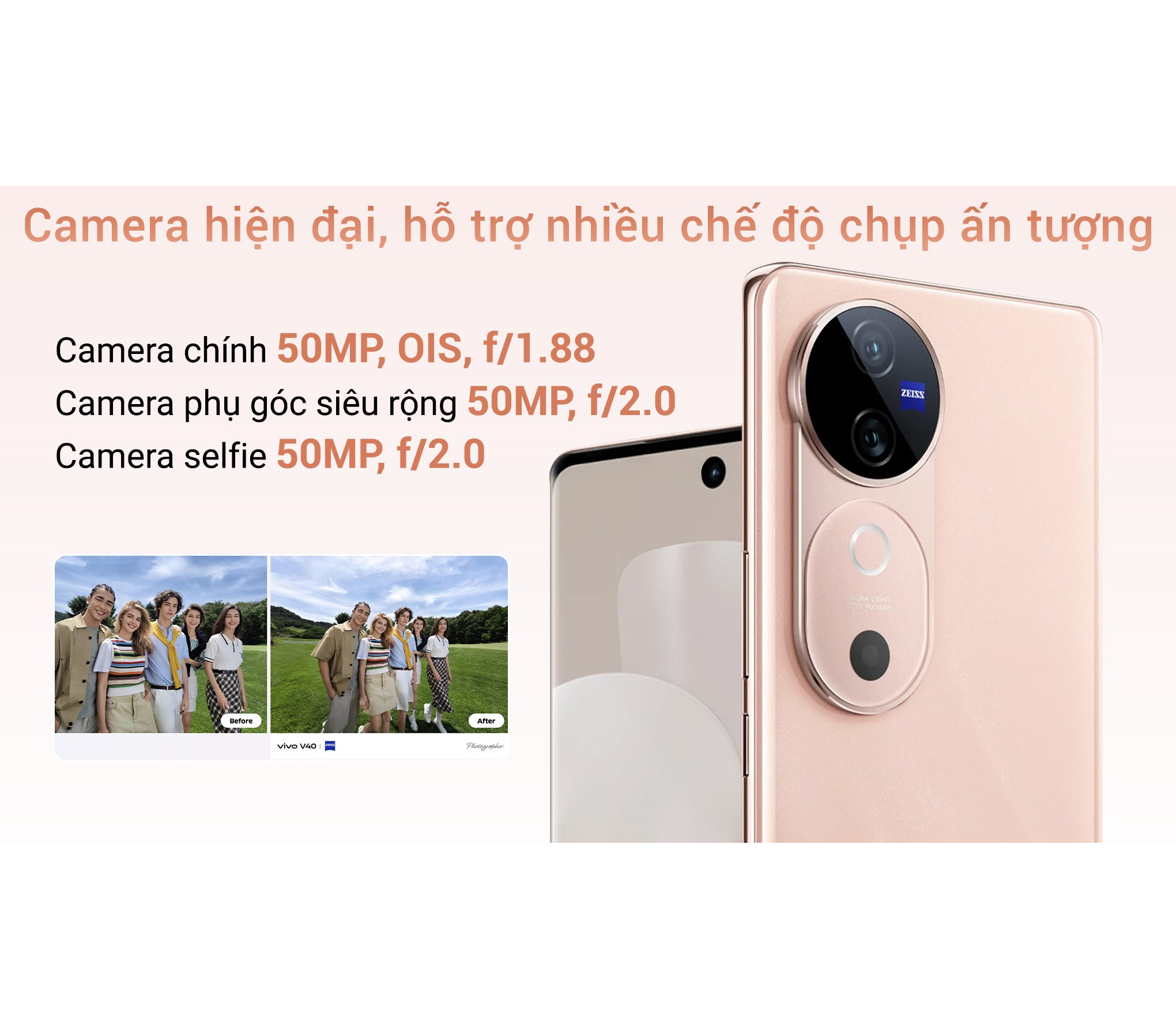 vivo V40 5G được trang bị camera chính ZEISS OIS 50 MP, cho khả năng chụp ảnh rõ nét nhờ công nghệ ổn định quang học tốt. Cảm biến này sẽ tăng cường lượng ánh sáng lên đến 2.8 lần so với những thiết bị không có OIS, làm giảm thiểu hiện tượng mờ nhòe và giữ lại chi tiết sắc nét ngay cả trong điều kiện thiếu sáng.
