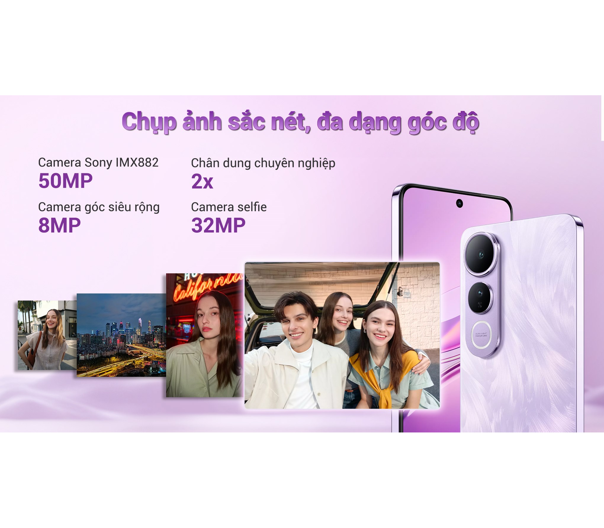 Chiếc điện thoại vivo này được trang bị hệ thống camera sau cao cấp với cảm biến Sony IMX882 có độ phân giải 50 MP và camera phụ 8 MP. Hệ thống camera này giúp tạo ra những bức ảnh có chất lượng cao, rõ nét và sinh động. Với sự hỗ trợ của vòng sáng Aura AI kết hợp khẩu độ lớn f/1.79 và f/2.2 giúp tăng cường ánh sáng tự nhiên cho các bức ảnh chân dung, đặc biệt hữu ích khi bạn chụp trong điều kiện ánh sáng yếu.