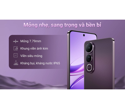 Với độ mỏng ấn tượng chỉ 7.79 mm và khối lượng nhẹ 197g, vivo V50 Lite 5G mang đến sự tiện lợi tối đa cho việc di chuyển, trở thành người bạn đồng hành lý tưởng cho những người dùng năng động. Ngoài ra, điện thoại còn mang đến ba phiên bản màu sắc thời thượng gồm đen, tím và vàng, mở ra nhiều lựa chọn để người dùng thể hiện cá tính riêng.