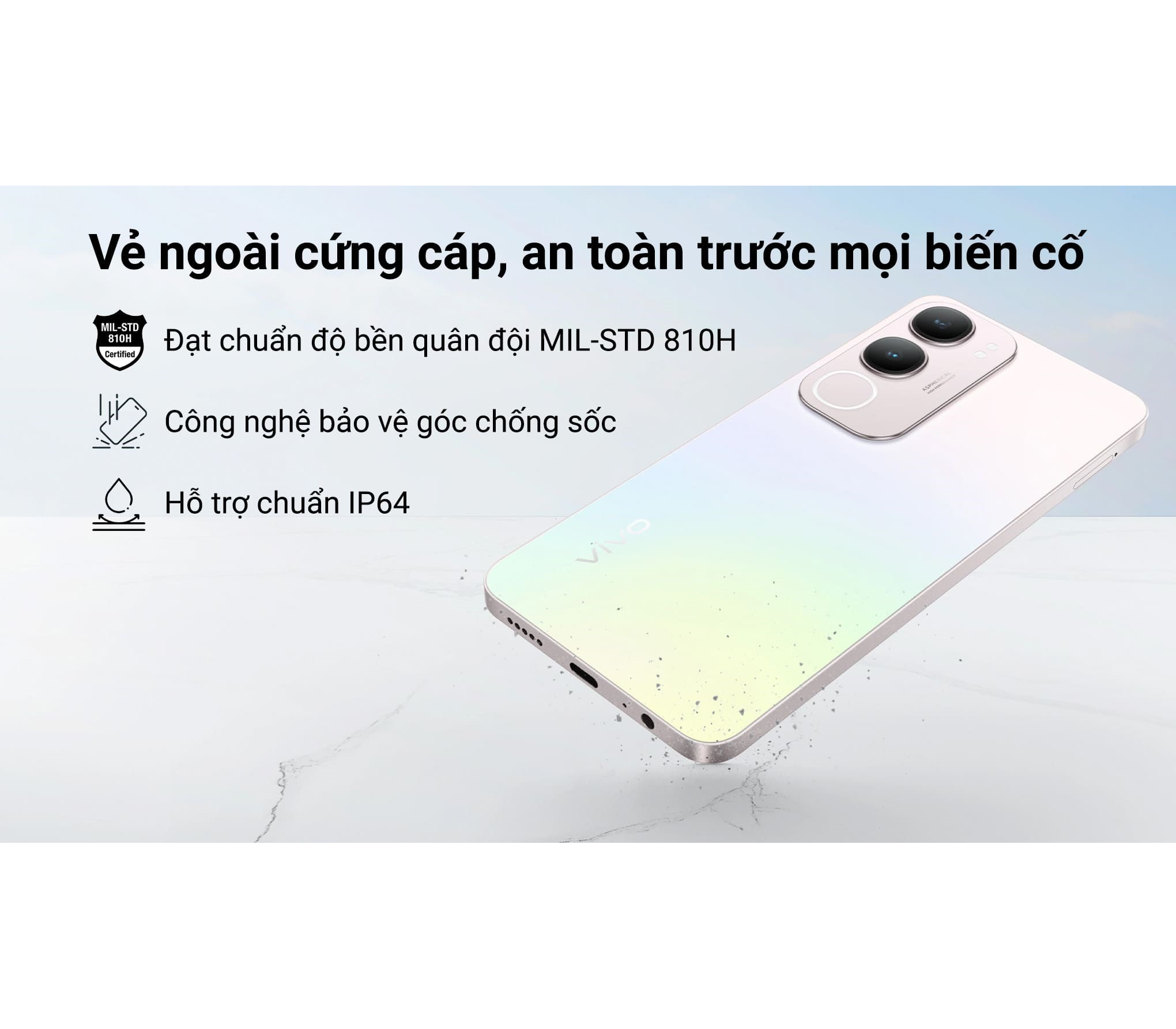 vivo Y19s Pro nổi bật với thiết kế tinh xảo cùng độ bền vượt trội. Thiết bị này tự hào đạt chứng nhận chống rơi 5 sao từ SGS và chuẩn quân đội, cùng khả năng kháng bụi, nước bắn IP64. Cấu trúc bền bỉ giúp giảm thiểu hư hại khi va chạm và đảm bảo hoạt động trơn tru ngay cả khi tay ướt, biến Y19s Pro thành bạn đồng hành lý tưởng cho người dùng năng động.