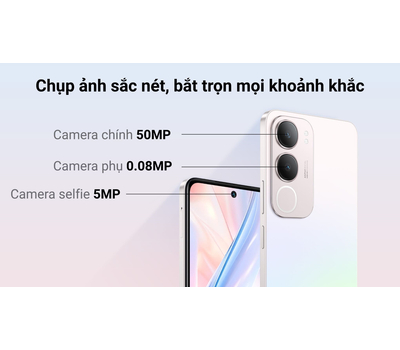 Chiếc điện thoại vivo này trang bị cụm camera sau ấn tượng với camera chính 50 MP ghi lại hình ảnh sắc nét, chi tiết sống động và màu sắc chân thực, giữ nguyên chất lượng khi phóng to hoặc cắt ghép. Camera chân dung 5 MP chuyên dụng tạo hiệu ứng xóa phông tự nhiên, làm nổi bật chủ thể tinh tế hơn hẳn so với xử lý phần mềm thông thường.