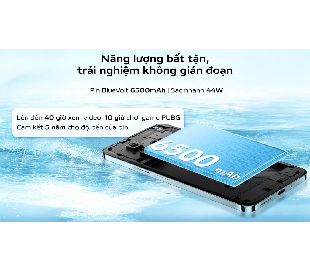 vivo Y39 5G sở hữu viên pin BlueVolt 6500 mAh, vượt trội so với mặt bằng chung. Theo thử nghiệm của vivo, máy có thể xem video hơn 40 giờ, dùng GPS hơn 13 giờ hoặc chơi PUBG hơn 10 giờ liên tục. Dung lượng lớn này giúp thiết bị đáp ứng tốt nhu cầu nặng trong cả ngày, thậm chí kéo dài đến 2-3 ngày với mức dùng thông thường.
