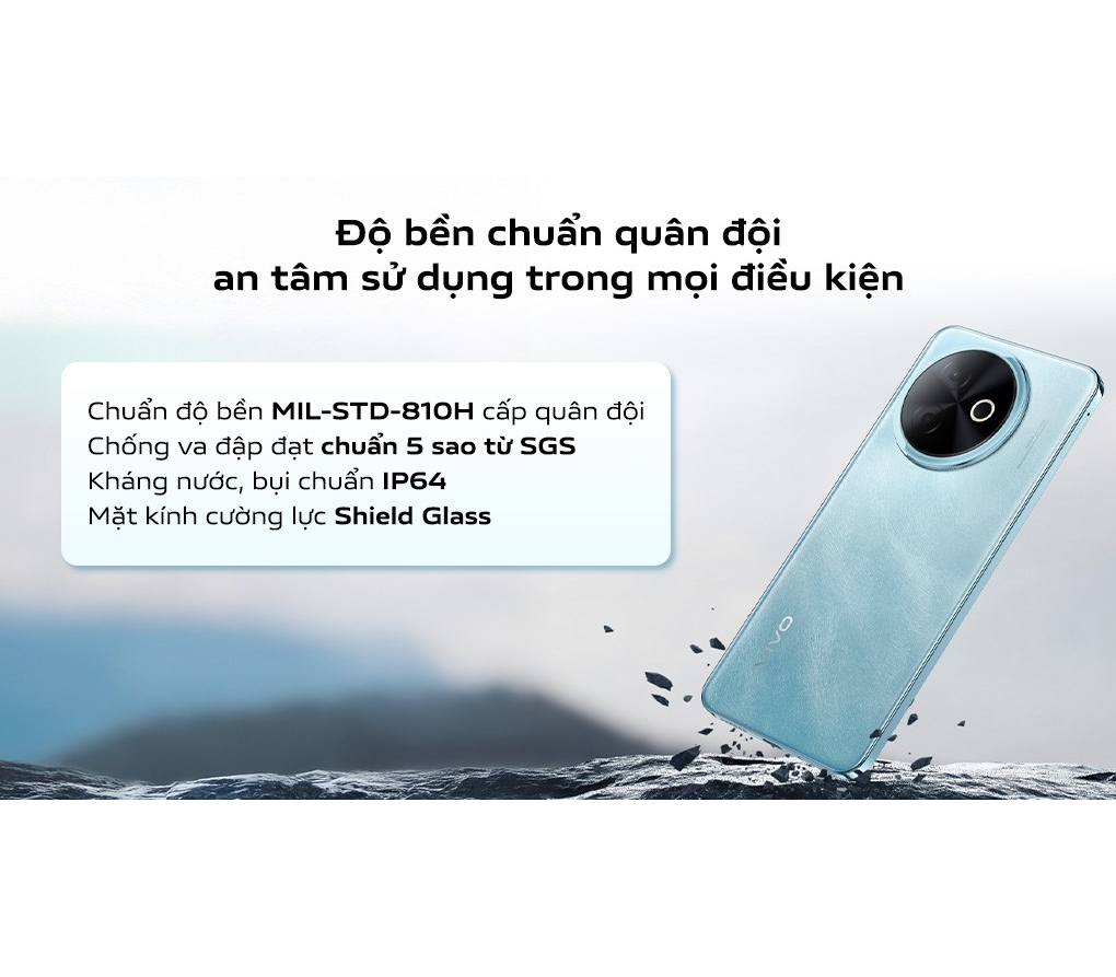 vivo Y39 5G được trang bị cấu trúc bảo vệ đa lớp đạt chuẩn MIL-STD 810H và chứng nhận chống va đập 5 sao từ SGS, với khung bên trong gia cố và lớp đệm hấp thụ lực hiệu quả. Mặt kính Shield giúp bảo vệ màn hình tốt hơn trước va đập, kết hợp cùng khung nhôm đúc và lớp đệm bo mạch chủ tạo nên cấu trúc bền bỉ, giảm hư hại khi rơi rớt.