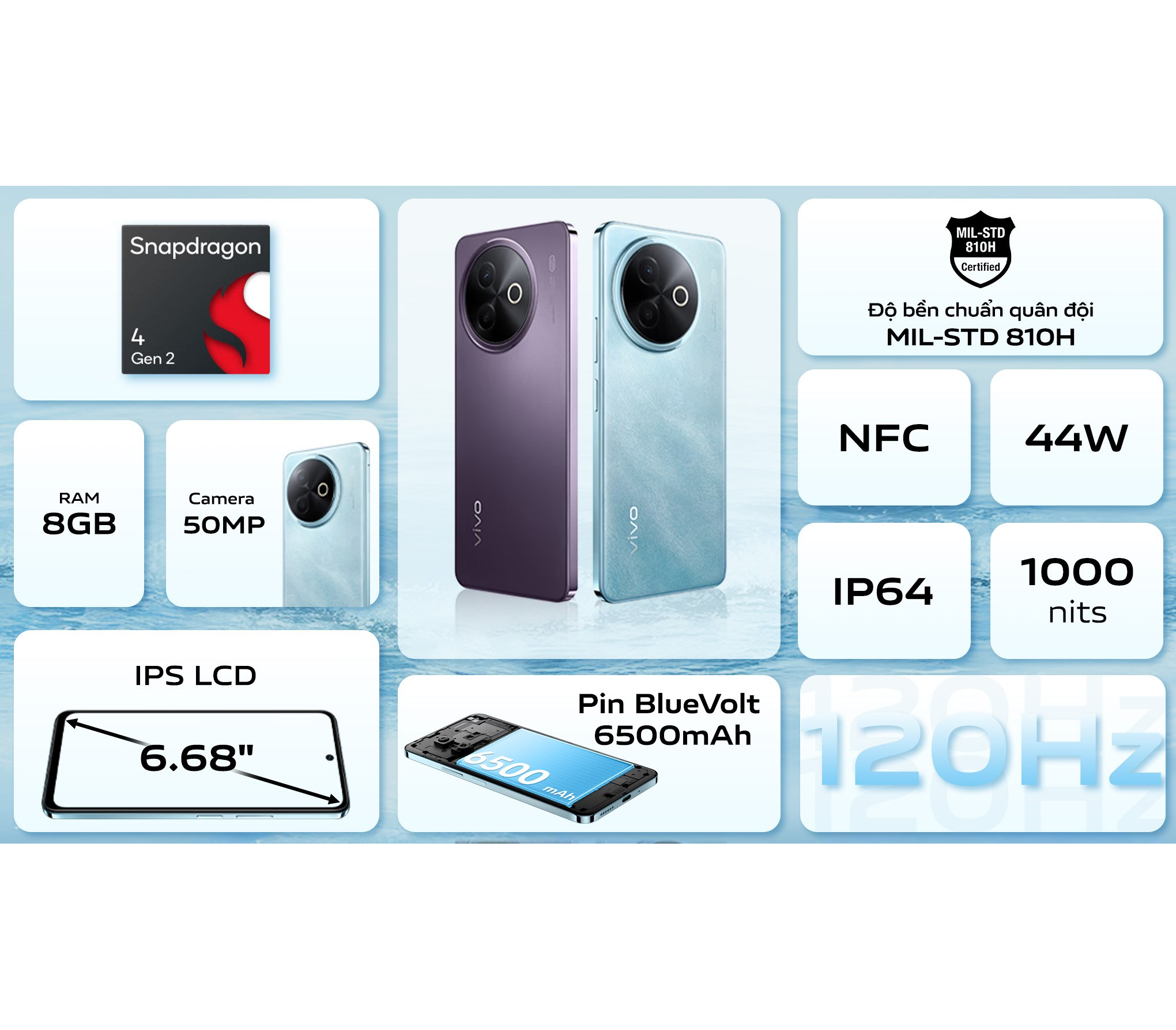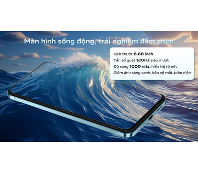 Chiếc điện thoại vivo này sở hữu màn hình IPS LCD 6.68 inch, tần số quét 120 Hz cho trải nghiệm mượt mà. Độ phân giải HD+ được chọn để cân bằng giữa chất lượng hiển thị và tiết kiệm pin. Màn hình đạt độ sáng tối đa 1000 nits, đảm bảo hiển thị rõ dưới nắng gắt, đồng thời đạt chứng nhận TÜV Rheinland giúp giảm ánh sáng xanh, bảo vệ mắt khi dùng lâu.