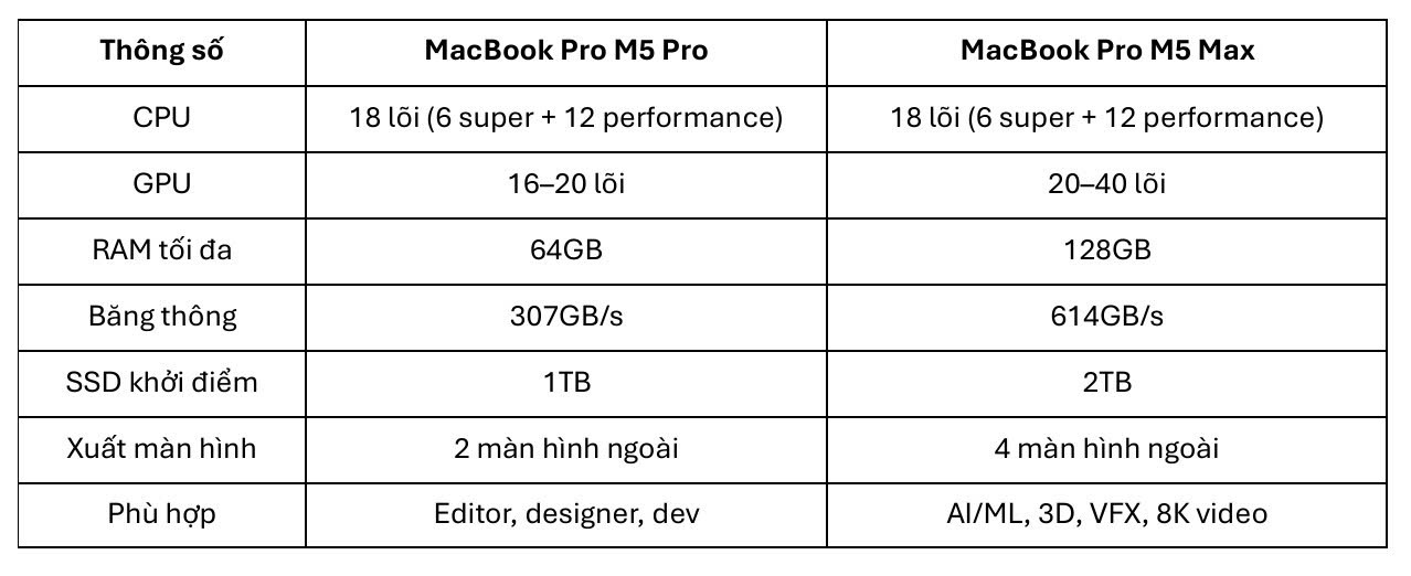 Nhưng điểm khác biệt chiến lược nằm ở GPU và bộ nhớ. M5 Pro là lựa chọn tối ưu cho đa số chuyên gia, trong khi M5 Max là "quái vật" thực thụ dành cho những ai cần sức mạnh đồ họa và AI không giới hạn.