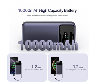 Duzzona P1 10000mAh Power Bank là pin sạc dự phòng dung lượng 10.000mAh, thiết kế nhỏ gọn và tích hợp nhiều công nghệ sạc nhanh, phù hợp cho người dùng điện thoại và thiết bị di động khi đi làm, du lịch hoặc di chuyển nhiều.
