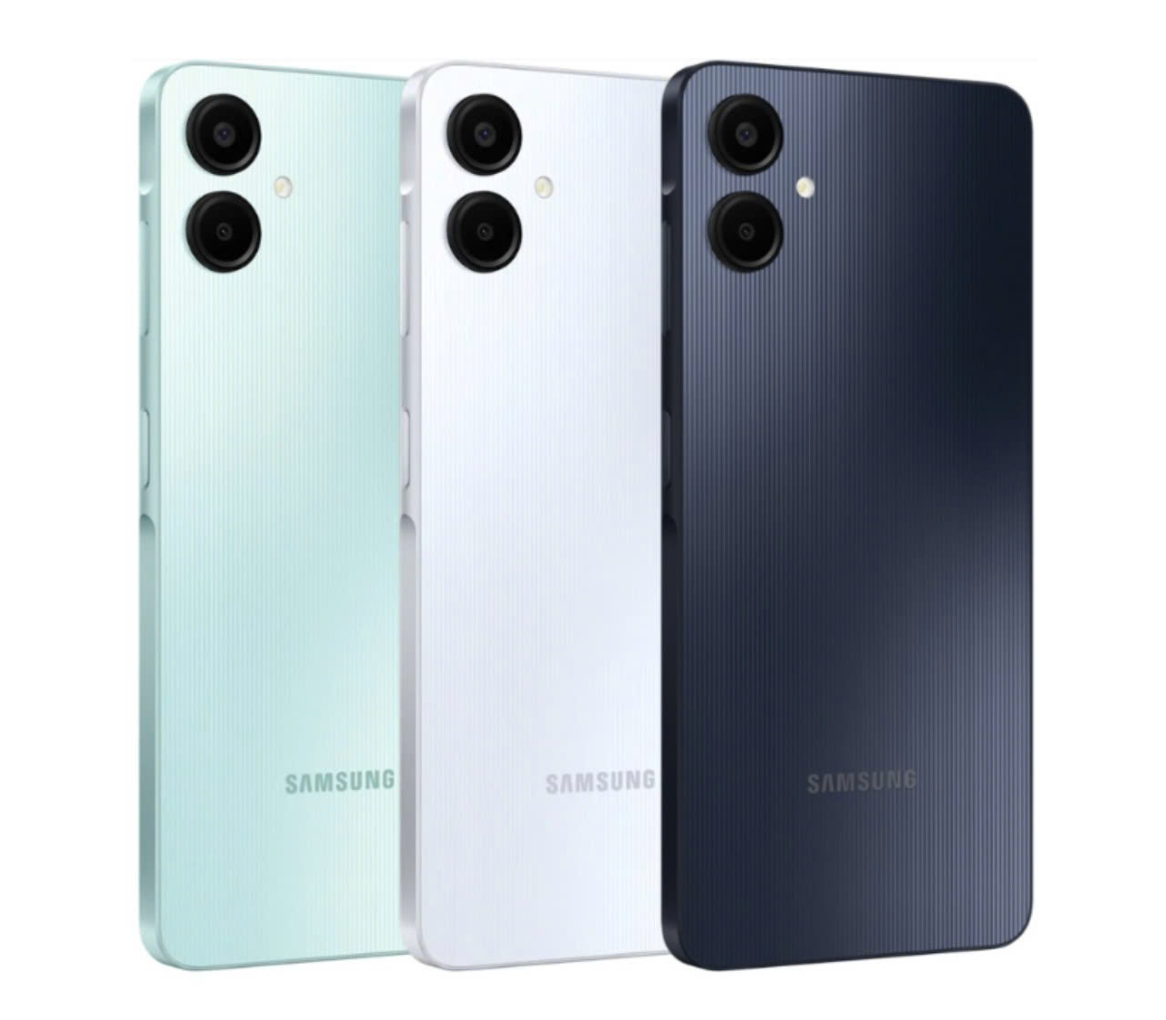 Mặt bên của 4 chiếc Galaxy A06 có màu Xanh Nhạt, Vàng, Xanh Nhạt và Đen được hiển thị. Mặt sau của Galaxy A06 màu đen cũng được hiển thị, làm nổi bật thiết lập camera kép và thiết kế tổng thể mỏng hơn.