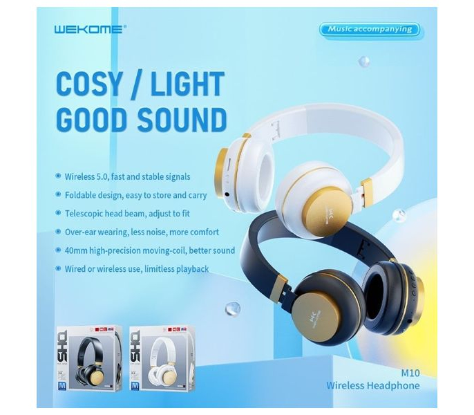 WEKOME M10 là tai nghe Bluetooth chụp tai (over-ear) thiết kế hiện đại, dùng để nghe nhạc, xem phim hoặc chơi game trên điện thoại, laptop và tablet. Tai nghe hỗ trợ kết nối không dây Bluetooth 5.0 và có thể dùng thêm dây AUX 3.5 mm khi cần.