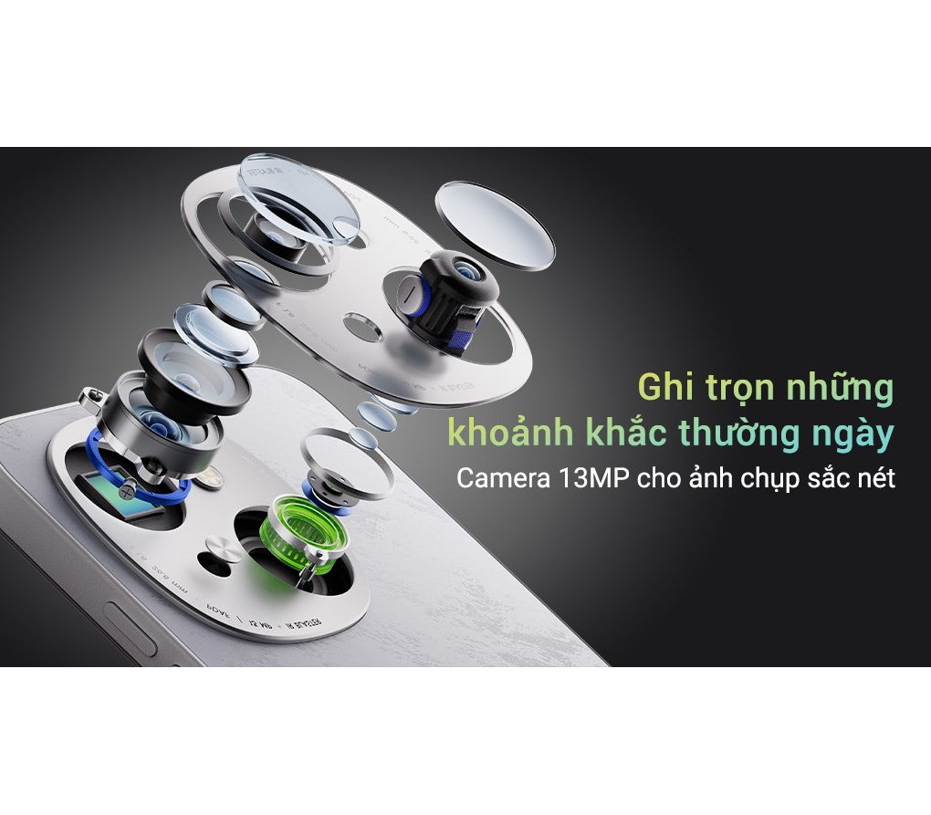 Về dung lượng, máy được trang bị RAM 3 GB và bộ nhớ trong 64 GB, đáp ứng tốt nhu cầu lưu trữ và sử dụng cơ bản. Ngoài ra, máy hỗ trợ mở rộng thêm 3 GB RAM ảo, nâng tổng dung lượng RAM lên 6 GB, giúp đa nhiệm mượt mà hơn và tối ưu hiệu suất. Đây là lựa chọn phù hợp cho người dùng cần một chiếc điện thoại bền bỉ và tiết kiệm trong thời gian dài.