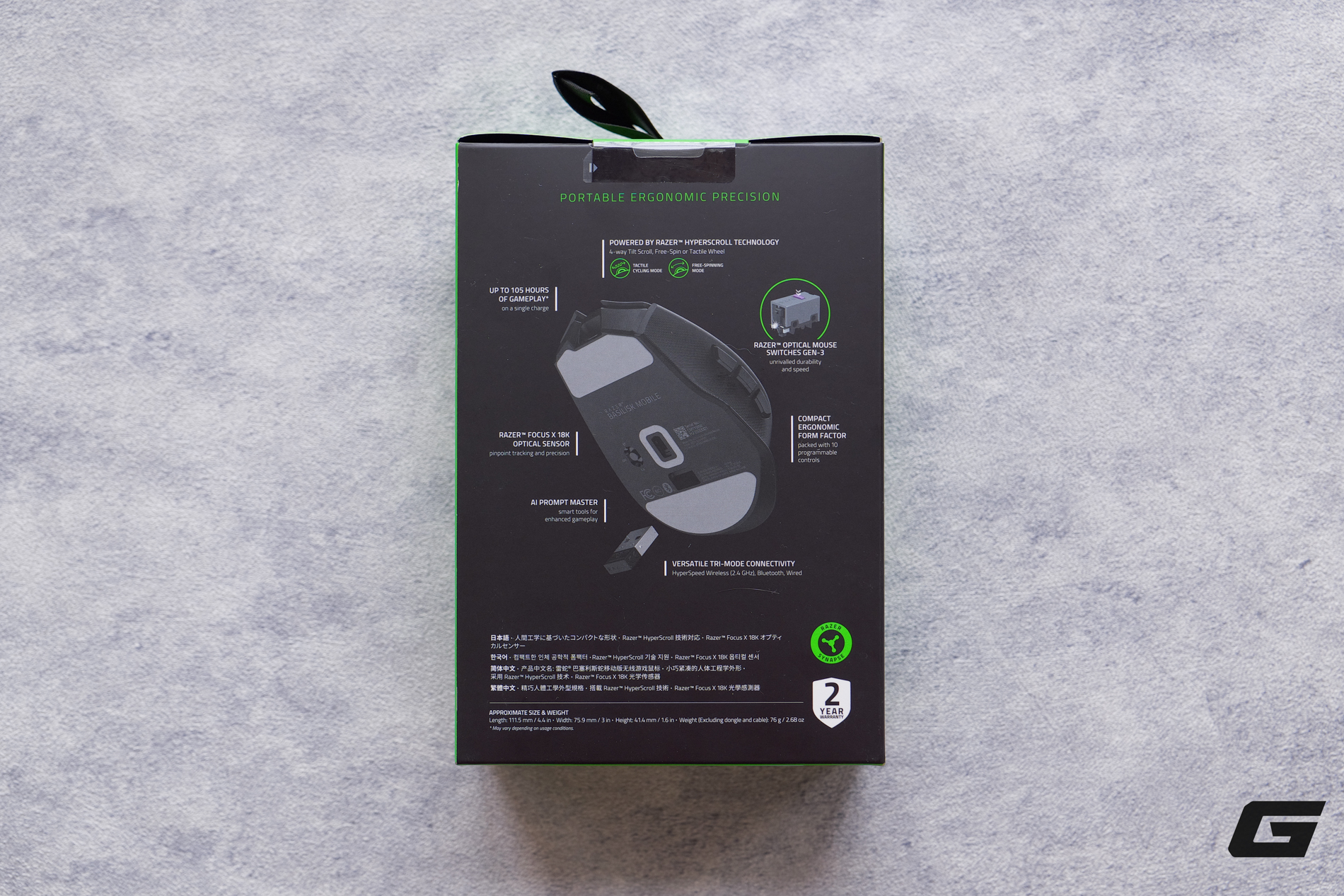 Chi tiết hơn mặt sau của Basilisk Mobile, Razer tiếp tục lối trình bày trực quan với sơ đồ nhanh các công nghệ cốt lõi, xoay quanh thông điệp "Portable Ergonomic Precision" .