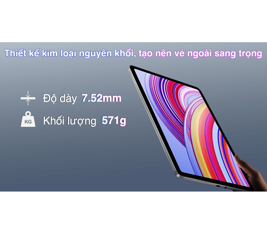 Redmi Pad Pro ghi điểm nhờ ngôn ngữ thiết kế mặt lưng phẳng với bốn góc bo cong mềm mại mang đến vẻ đẹp hiện đại và sang trọng. Được chế tác từ kim loại và trải qua quá trình gia công tỉ mỉ, tạo nên sự đồng nhất về mặt thẩm mỹ và độ hoàn thiện cao.