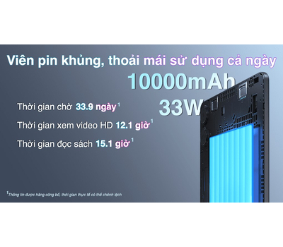 Cung cấp năng lượng cho Redmi Pad Pro là viên pin 10.000 mAh, cho phép bạn sử dụng liên tục cả ngày với các tác vụ thông thường như đọc sách, lướt web, xem phim,... trước khi phải sạc lại. Với các tác vụ nặng hơn như chơi game, sử dụng màn hình với độ sáng cao thì thời lượng dùng có thể ngắn hơn. Dù vậy, bạn cũng không cần quá lo lắng, công nghệ sạc nhanh 33 W sẽ giúp bạn rút ngắn thời gian chờ sạc lại thiết bị.